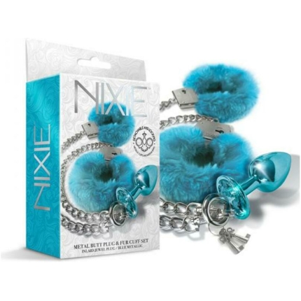 Nixie Metal Butt Plug & Furry Handcuff Set Mediumblue Metallic
