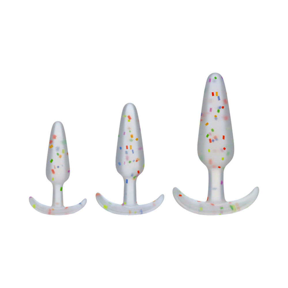 The Mood Naughty 1 Trainer Set in premium silicone is now available in rainbow confetti. This pack includes the best-selling Mood Naughty butt plug in three sizes: 3, 4, and 5 inches. This colorful set is perfectly shaped and sized to gently expand the boundaries of one’s anal experience. The classic tapered tip of Mood Naughty slides right in, and the firm-yet-flexible material and curved rocker base make these plugs comfortable and safe for extended wear. Features: Luxurious Velvet-Touch Silicone 3 Sizes for Gradual Anal Training Tapered Tip for Easy Insertion Curved Base for Comfort Between the Cheeks Warms to Body Temperature Easy to Clean – Top Rack Dishwasher-Safe Hypoallergenic, Nonporous, and Odorless Phthalate-Free, Body-Safe Measurements: Total Length – Small: 3.25 in. (8.3 cm) – Medium: 4 in. (10.2 cm) – Large: 5 in. (12.7 cm) Insertable/Usable Length – Small: 3 in. (7.6 cm) – Medium: 3.75 in. (9.5 cm) – Large: 4.75 in. (12.1 cm) Width/Diameter – Small: 0.75 in. (1.9 cm) – Medium: 1 in. (2.5 cm) – Large: 1.25 in. (3.2 cm) Circumference – Small: 3 in. (7.6 cm) – Medium: 3.5 in. (8.9 cm) – Large: 4.25 in. (10.8 cm)