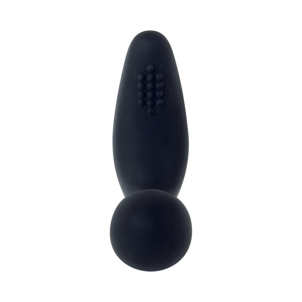 This smooth silicone vibrating prostate toy is ergonomically shaped to reach the P-spot easily. Includes powerful bullet with 10 separate functions. Submersible. Easy grip handle doubles as a safety base. Rechargeable, with cord included. Measures 4.75 in. high by 1.25 in. wide.