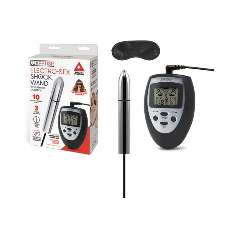 This premium set is designed to introduce you the titillating, unique sensations of electrostimulation. This one-of-a-kind device features 10 speeds, 3 unique patterns, and is crafted from smooth, sleek metal for a truly stimulating experience. The high-quality, body-safe metal construction of the Shock Wand ensures a hygienic and gratifying experience, while its sleek design allows for effortless targeting of your most sensitive areas. The easy-to-maneuver remote control provides added convenience and allows you to effortlessly switch between settings and intensities. Included in the set is a satin blindfold that will let your imagination run wild as you explore new sensations and desires. Perfect for beginners and experienced enthusiasts alike, the Electro-Sex Shock Wand with Remote Control is an essential addition to any collection.Features 5.5″ (14 cm) Insertable length 10 Adjustable speeds and power levels 3 Unique patterns Smooth sleek metal Perfect for electro-sex beginners Electro-stim power unit; adjustable intensities for tailored stimulation Satin blindfold included Item Materials: Phthalate-Free ABS plastic, Aluminum Alloy.