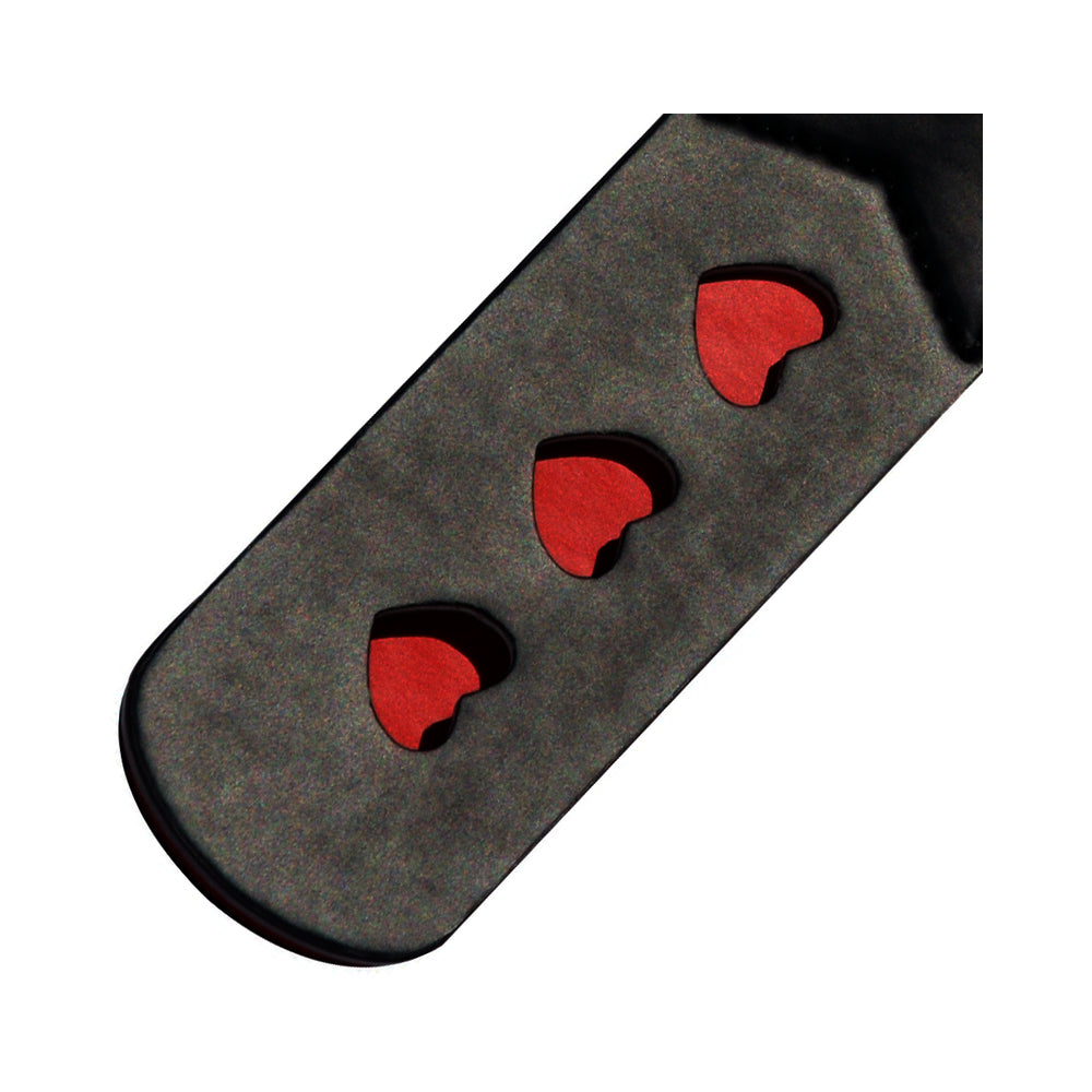 Spanking paddle made of quality vegan leather delivers a distinctive sound without inflicting too much force. Leaves a great impression of hearts behind. Rigid handle with wrist loop for a confident grip. Measures 12.5 in. long, 2.5 in. wide.