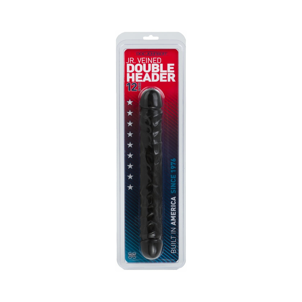 Classic Double Header. It’s like twofer or buy-one-get-one, only in this case it’s way better than the deal at the grocery store. The 12in Jr. Double Header Dong is the ultimate sex toy for shared orgasmic pleasure. Each end of this tantalizing dildo features a realistic tip, joined in the middle by a luscious, lifelike black shaft, complete with bulging veins. It’s like two dongs in one! Use with a partner or enjoy all 12in of this twofer by yourself.