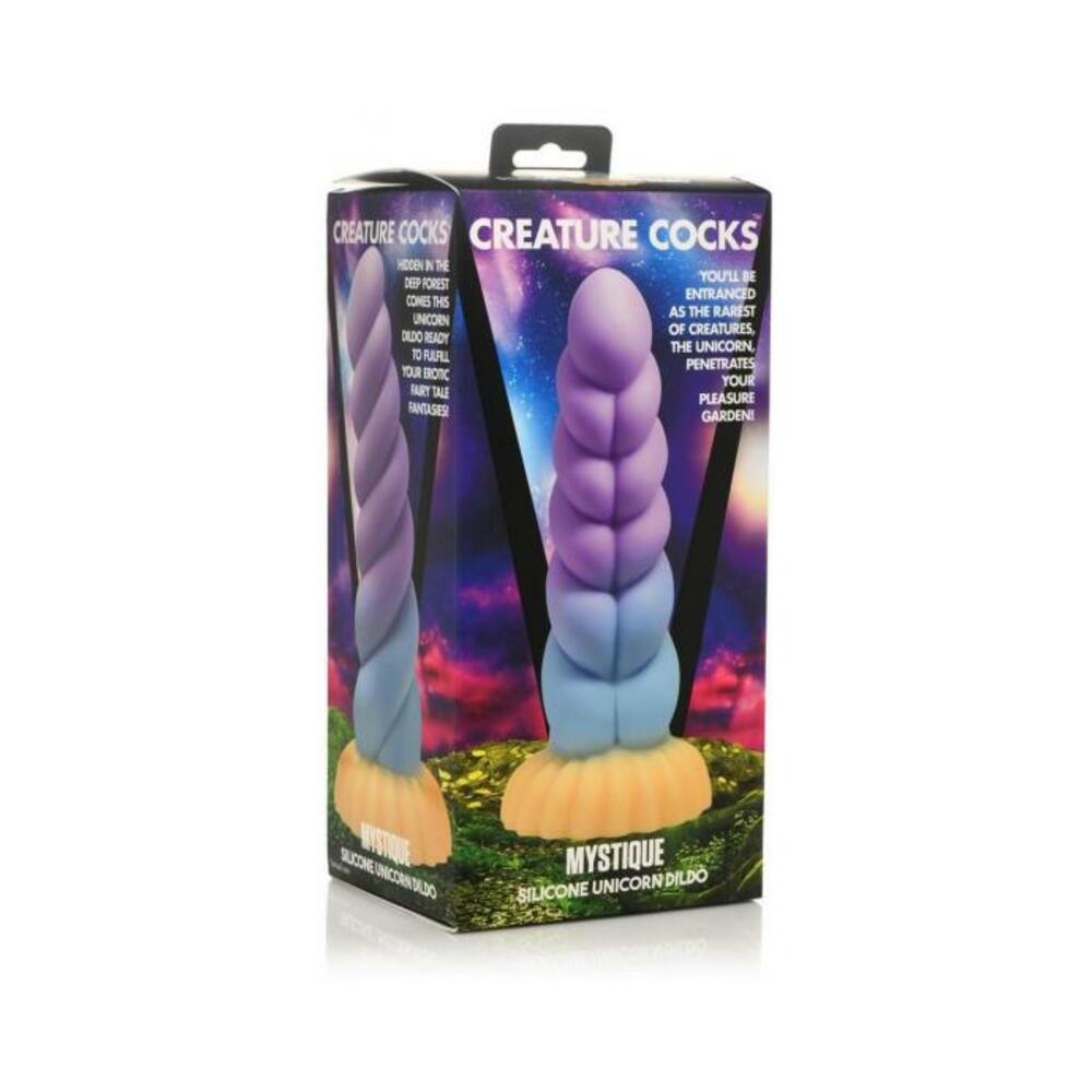 Feeling horny and craving just a little magic? This unicorn horn dildo is the perfect addition to any fantasy, fairytale or mythical roleplay! Made out of body-safe, phthalate-free, premium silicone, this silky smooth and plush dildo is shaped like the mythical beast of lore’s proud and magical horn! Its thick, twisted, ropes intertwine to form a horn that is smooth with delicious, robust ridges and bumps that enhance every penetrative moment of pleasure! This phenomenal horn dildo is colored with soft hues of purple, blue and orange and can be used with a partner or alone. The strong, suction cup base can be pressed firmly against any surface for a hands-free ride or it can be combined with a compatible strapon harness for sexy roleplay, erotic cosplay and pegging fun! After play is over, wash the dildo with warm water and soap and use a toy cleaner to spray clean. Wipe dry and store in a cool, dark place out of direct sunlight.On a long walk through a forest, you decide to step away from the road and take the path less traveled. The brush is thick and vines wind up the trees to mix with moss and dew. The mist is thick and low but there’s something calling you, as if a whisper moan on the wind, an echoing sound that wakens yearning in your loins. Excitement rises as the mist clears and you see a clearing. Your heart nearly jumps into your throat as you see the most beautiful and mythical creature of them all; a unicorn of legend! Their pelt shimmers iridescent in the soft haze of dispersed light, a silver glow hangs around them like a veil. They turn their head to face you and your eyes meet for a moment that feels like eternity. In a flash, the haze blurs and they’ve transformed into a man, the twisted horn on their head now between their thighs. You realize now they were calling you and you did not discover them; they let you find them. Their heavy dong hangs low between their legs as swings from side to side as they confidently stride towards you. Tall, strong and lean, they take you in their arms, their gaze piercing your soul, and the horn soon to pierce your wet and lustful loins.Measurements: Overall length: 8.3 inches. Insertable length: 7.3 inches. Narrowest insertable diameter: 1.5 inches. Widest insertable diameter: 2.4 inchesMaterials: SiliconeColor: Purple, Blue, Orange Key Features: Fantasy Dildo: This colorful, unicorn horn dildo is perfect for making all your mystical, magical, fairytale desires come true! Ride on the swirling, thick bumps of twisted horn and enjoy the graduated shaft that ends on a round, wide base! Suction Cup Base: Enjoy the wide, suction cup base of this dildo. Simply press firmly on any flat surface and enjoy riding it hands-free! Harness Compatible: The wide, flanged base is compatible with most strap-on harnesses so you or a partner can wear the dildo and bring the fantasy fully to life! Premium Silicone: Made of body-safe, phthalate-free, premium silicone.