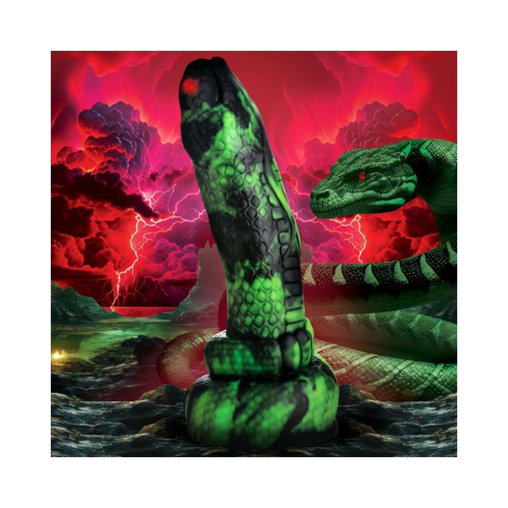This silicone python is meaty and ready to slither inside you! It has a large head with a tapered nose, red glowing eyes, and black and green scaled skin. The thick shaft will stretch you out as the big head rubs all the right spots! Made out of premium, flexible, phthalate-free silicone, this dong is body-safe and best used with water-based lubricants only. Enjoy hands-free rides due to the strong suction cup base! Invite a partner to indulge in kinky cosplay or fantasy roleplay and use their favorite harness to transform this dong into a strap-on! Afterward, make sure to wash it with warm water and mild soap, then spray it with a toy cleaner and air-dry. Keep out of direct sunlight and heat. You’ve danced many nights, performing with this python wrapped around your shoulders and neck, slithering over all your curves and climbing your muscles. You’ve performed for kings and queens, on stage for hundreds or a select few. Tonight, you take your trusty python out to practice. It slithers over your shoulders as usual, and you gaze at yourself in the mirror. Your body glistens in the dim candlelight, the flames flickering and lighting up shadows and firelight across your skin. The snake slowly moves, urging you to move with it. You undulate your spine, roll your belly, and dance the serpent dance. Each step and move puts you into a trance-like state as you dance. The music in the background sets your heart on fire. You feel the heat spreading through your body, from your belly to your chest to your fingertips. It burns deep in your loins, between your thighs, reaches the pads of your feet. You dance until you sweat, and the snake moves around you, dancing with you. It slithers around your thigh, moving differently than usual, and you bend down, kneeling, to give it access to the floor. Maybe it wants off? But no, it goes towards your inner thigh, then starts to wriggle its head between your thighs. You gasp in shock! You are so open, on fire, and turned on by the dancing. Its head pushes inside you, the sweat creating a slick entrance and you start to gasp and moan, in shock and unable to stop the strong python sliding deeper inside! It moves inside, the muscles squeezing, until you shudder in ecstasy and push it out! YOu collapse on the floor, your body reeling in pleasurable waves, until the snake coils itself on your chest, its tongue tasting the air near your throat. Measurements : Overall length: 9.6 inches. Insertable length: 7.25 inches. Narrowest insertable diameter: 2.1 inches. Widest insertable diameter: 2.5 inches. Materials : Silicone Color : Green, black, red