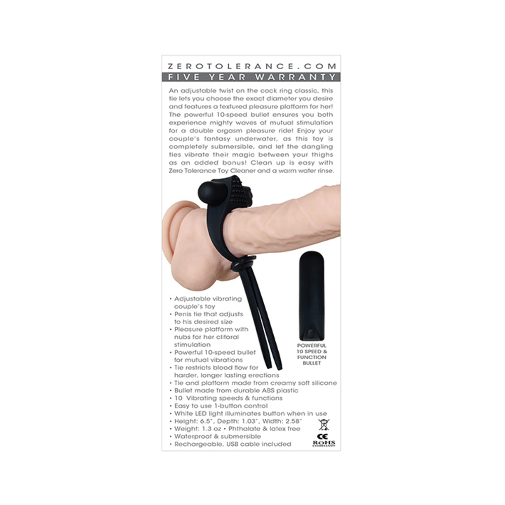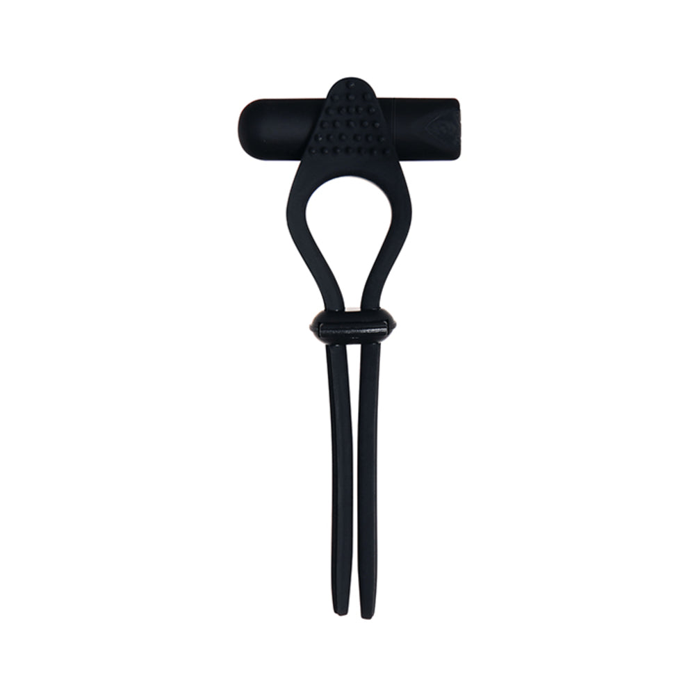Rechargeable silicone cock tie. Powerful bullet has 10 speeds & functions. Smooth silicone for a comfortable feel! COLOR: BLACK
