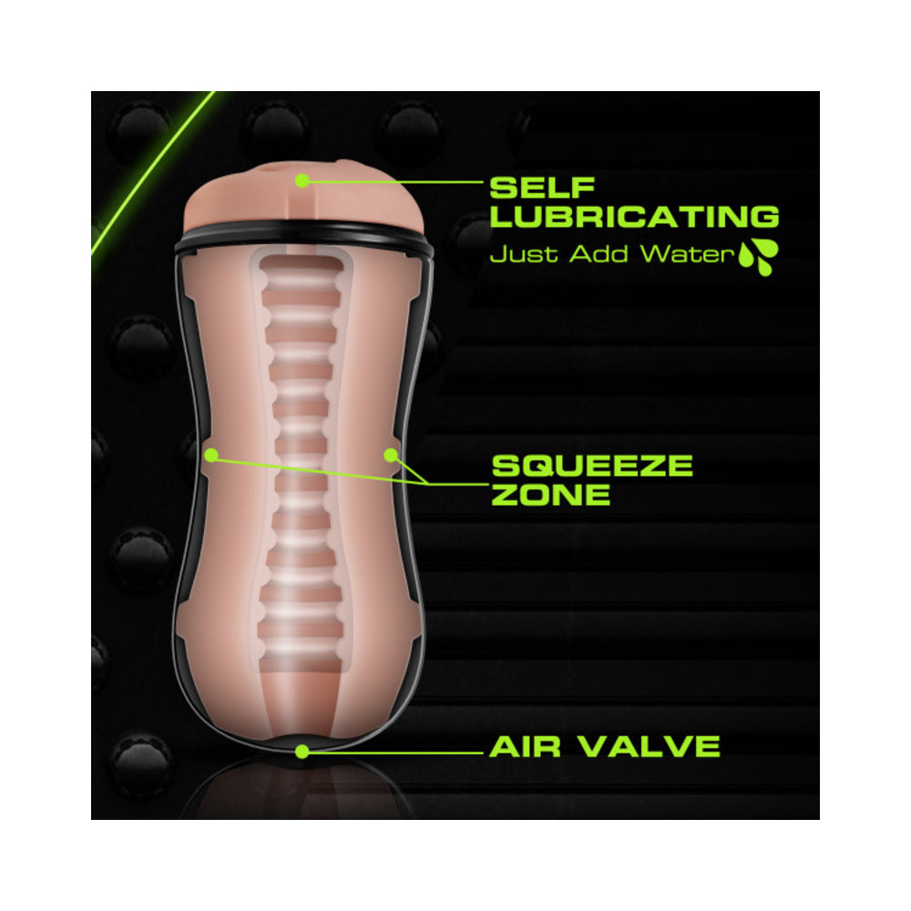 •SELF LUBRICATING – Slippery When Wet. Just Add A Little Water And Slide In •TEXTURED – Enjoy The Erotic Sensations As The Nubs And Ridges Massage Your Shaft •SUCK – Mild Suction Is Manually Activated By Manipulating Air Valve. A Nut Busting Experience •EXPLOSIVE – Orgasms From A Beautiful Pussy With A Tight Ribbed Orifice •CONTROL – Squeeze Center Of Cup To Tighten And Enhance Your Pleasure