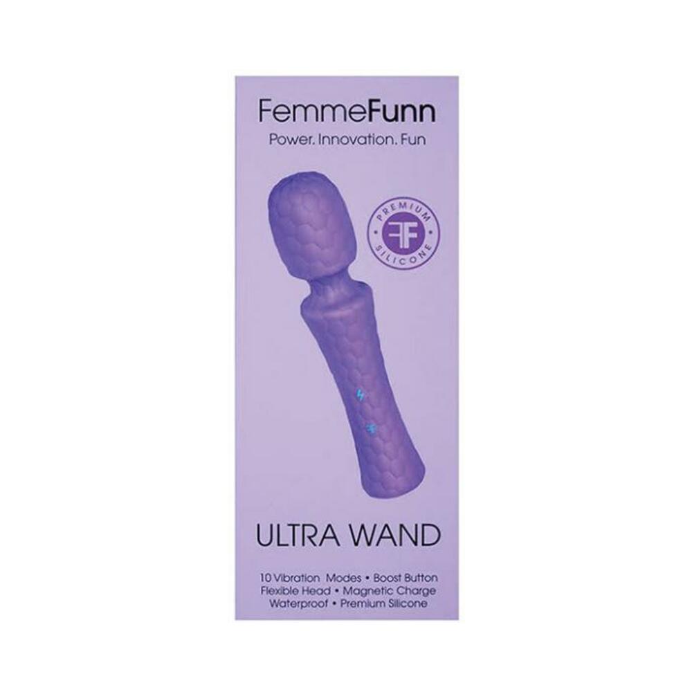 Femmefunn Ultra Wand Body Massager. Power where you want it. Our ergonomically designed body wand massager delivers earth shattering pleasure, without shattering your hand. Constructed to keep the power in its super flexible head, the Ultra Wand will bend at your will, and have you bending with bliss. Put the power in your hands. Features 10 powerful vibration modes. Boost Button. Flexible Head. Textured. 100% waterproof vibrations. Material Silicone. USB Magnetic rechargeable. 1 year warranty.