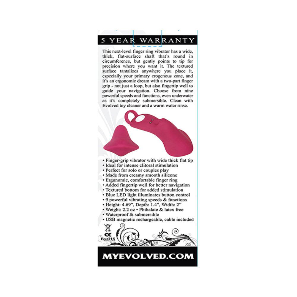This next-level finger ring vibrator has a wide, thick,flat-surface shaft that’s round in circumference, but gently points to tip for precision where you want it. The textured surface tantalizes anywhere you place it, especially your primary erogenous zone, and it’s an ergonomic dream with a two-part finger grip -not just a loop, but also fingertip well to guide your navigation. Choose from nine powerful speeds and functions, even underwater as it’s completely submersible. Clean with Evolved toy cleaner and a warm water rinse. Blue LED light illuminates button control. USB Magnetic rechargeable, Cable included. COLOR: BURGANDY