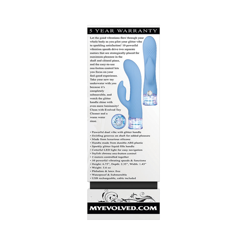 Let the good vibrations flow through your whole body as you pilot your glitter vibe to sparkling satisfaction! 10 powerful vibration speeds drive two separate motors that are strategically placed for maximum pleasure in the shaft and clitoral piece, and the easy-to-use one-button control lets you focus on your feel-good experience. Take your new toy underwater with you because it’s completely submersible, and watch the glitter handle shine with even more luminosity. Dual motors, 10 speeds & functions, LED light, phthalate and latex free, body-safe silicone. Height 6.75 inches, depth 2.35 inches, width 1.43 inches. Bulk weight 5.6 ounces. Waterproof vibrations and submersible for play outside the bedroom. USB rechargeable, cable included.